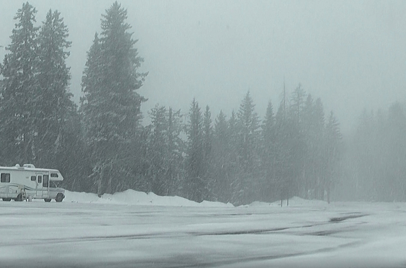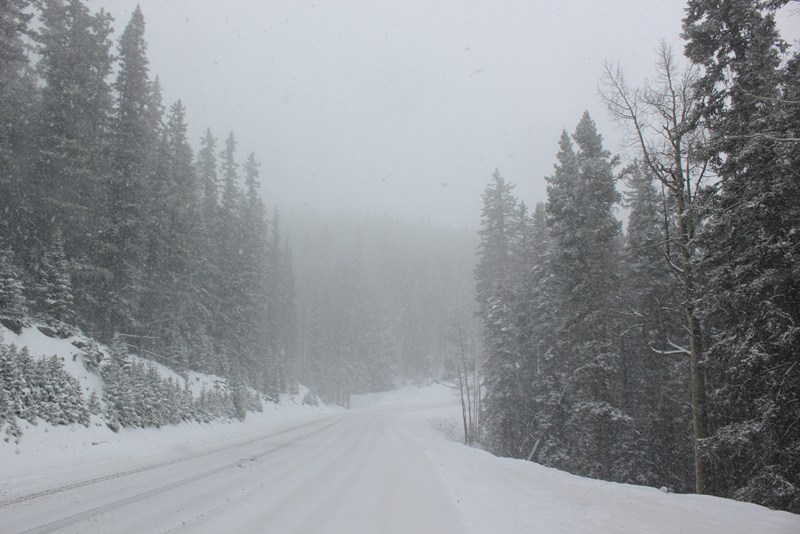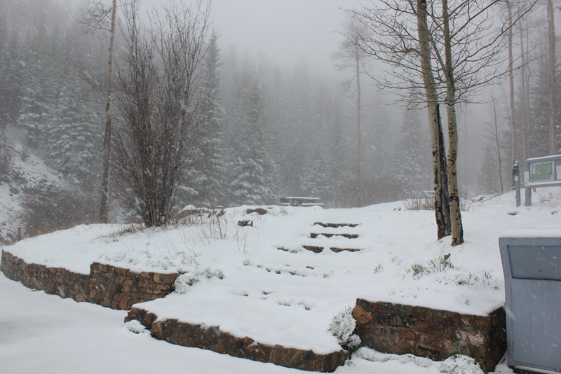 The air was still fairly warm in most of NM ahead of the cold front, though cooler than on previous days due to clouds and precipitation. At lower elevations, it was warm enough for rain. However, in the mountains above around 8500-9000 feet the precipitation occurred in the form of snow - and in some places, thundersnow, since the precipitation was convective in nature. Hoping to see some thundersnow, I made a couple trips up NM route 475 during the day. The first was in the early afternoon, as precipitation moving across the state became more convective in nature. As I drove up on this first trip, it was rain up into Hyde Memorial State Park, elevation around 8300 feet, but by the time I reached the upper part of the state park, there was snow on the ground and the falling rain became mixed with snow. By around elevation 9000 feet, it was all snow, and from the Big Tesuque picnic area (elevation 9675) up to the base of Ski Santa Fe (elevation 10350) there was a new snow accumulation of 3-4 inches. At times the snow fell quite heavily, sometimes accompanied by strong outflow wind. I was not successful in catching any thundersnow, although on the rare occasions when I could get a phone/internet connection (often not an easy thing in the NM mountains), I could see that lightning strikes were occurring as close as the Truchas area, less than 20 miles to my northeast, as a particularly heavy cell moved up into the mountians in that area. In fact, thundersnow occurred not only around Truchas but also pretty much everywhere in the mountains from Taos Ski Valley to the Colorado state line, so my idea that there could be thundersnow was not crazy! Here are a few pictures of the falling and accumulated snow in the mountains: