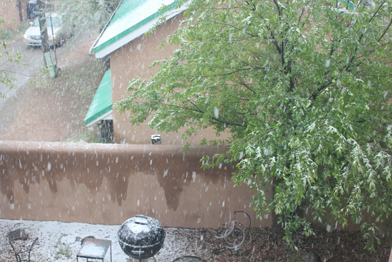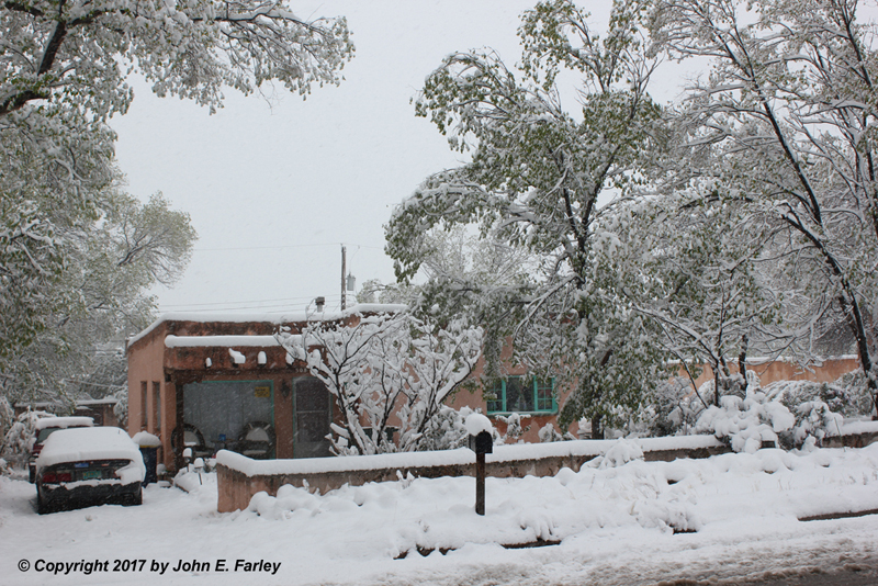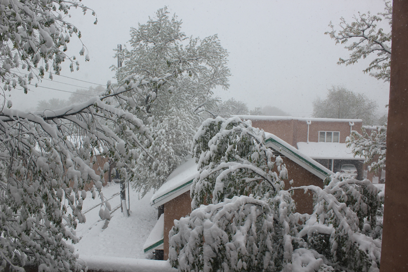 Snow this late is not unusual in Santa Fe, but this much snow is. According to the local paper, this is the heaviest snow on record this late in the season, although records from a few years are missing. The latest measureable snow in Santa Fe occurred on May 7, 1969. Any snow this late is pretty unusual in Albuquerque, where the official reporting station received 0.7" but some locations in the northeast heights got around two and a half inches. The official snowfall there was the fourth latest on record, ever.