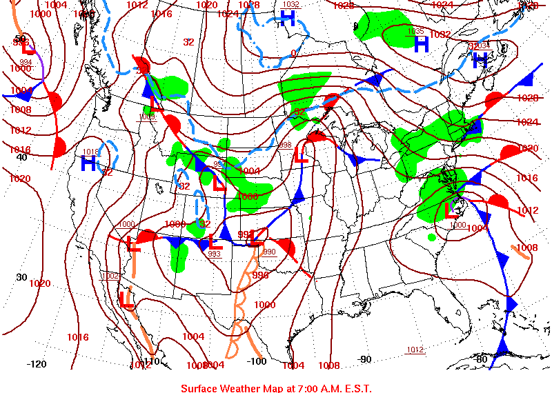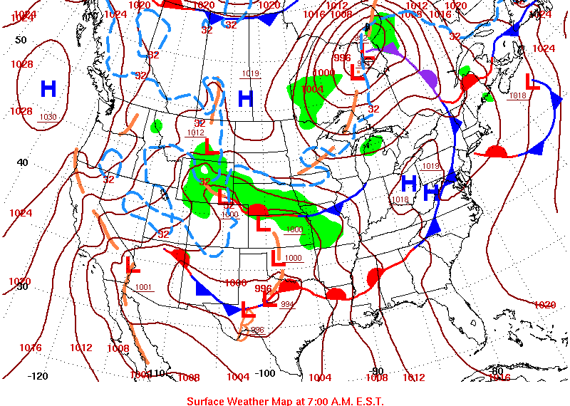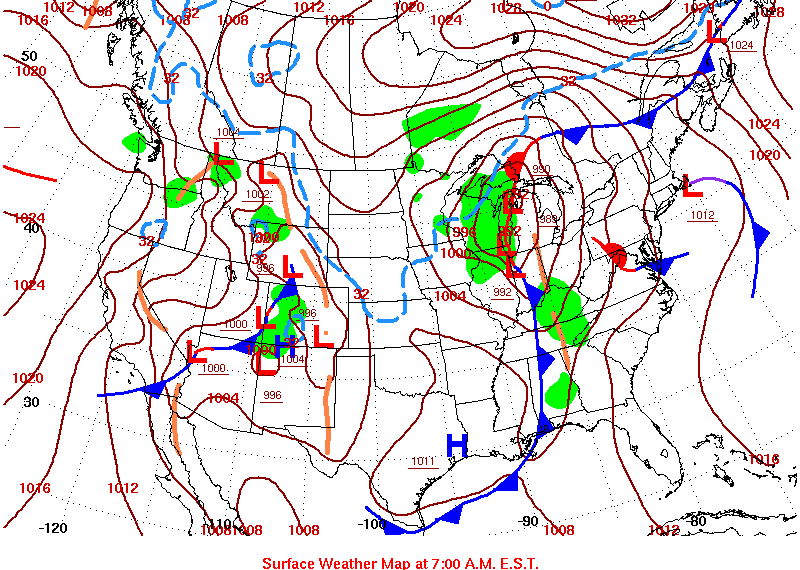 This was the day of the big snow! By now, the upper low had shifted southward into western NM, from where it would drift slowly east before turning to the northeast. The main surface lows with this system were over southern OK and TX, with a very large area of moisture-fed precipitation north of the stationary (soon to be warm) front extending ENE from the low, and in the cold air northwest of the surface low pressure. This meant precipitation in some form occurring most everywhere from NM and CO to the Great Lakes. Heavy snow in parts of CO and NM, and heavy rain eastward to the Great Lakes north of the warm front. As the day went on, severe weather would break out along and south of the warm front, with flooding rains along and north of it. Here is the morning surface map for April 29: