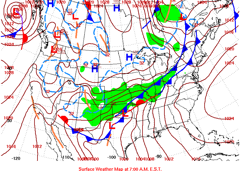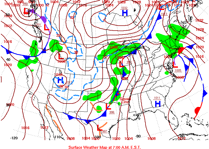 The effects of the next impulse coming down from the main storm were felt on Thursday, April 27. Looking at the surface map below, note that the cold front associated with the first impulse has now moved all the way to the Gulf of Mexico, while several areas of low pressure associated with the next impulse are scattered around Colorado and New Mexico. At this time the main upper low was still well off to the northwest, though, in the Pacific Northwest:
