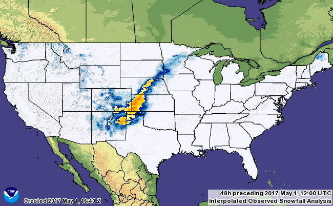 After passing New Mexico, the snow moved northeast across the northwestern TX Panhandle and the western OK Panhandle, dropping up to a foot of snow in a few spots and causing more road closures. In western Kansas, 12-16 inches fell in portions of the Dodge City and Goodland National Weather Service areas, with wider areas that got lesser amounts. And in many areas, blizzard conditions with near zero visibility and winds up to 65 miles per hour. The combination of wind and snow forced many road closures, and downed trees and power lines in many areas, resulting in extended power outages. After Kansas, the snow continued northeastward across south central to northeastern Nebraska, the southeast corner of South Dakota, and then across southwestern, central, and northeastern MN. The map below shows 2-day snow accumulations ending at 6 a.m. MDT May 1. Note that this map understates accumulations in parts of Colorado (especially the northern part) and New Mexico because the snow began before the time period covered by the map, and also possibly in parts of Minnesota where snow continued beyond the early morning hours of May 1. However, it does give you a sense of the snowstorm's track through roughly the eastern halves of CO and NM, then northeastward across the Plains to the Upper Midwest.