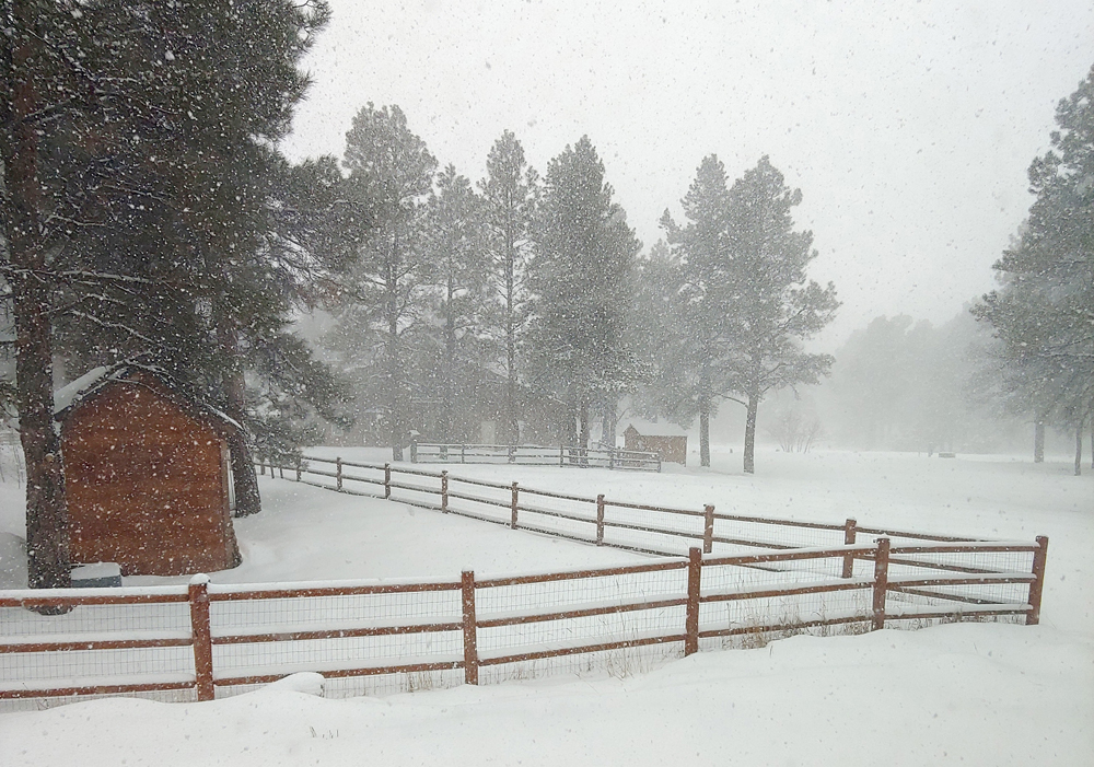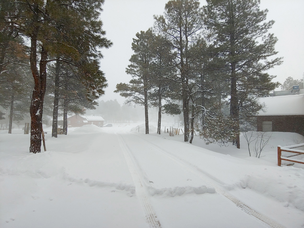 In southwest Colorado, the second wave of the AR event brought two more feet of snow to the Wolf Creek Ski Area, bringing their 4-day storm total to more than 3 feet. Not far west of there, the Purgatory ski area got more than two feet. High-valley locations like Durango and Pagosa Springs that got rain and sleet with the first wave of the AR event got snow this time, with up to 6 inches in the Durango area and around 7 inches in Pagosa Springs. A period of steady snow fell in these areas, followed by temporary clearing and then intermittent brief but intense convective snow squalls. This picture shows one of these squalls in Pagosa Springs on February 6: