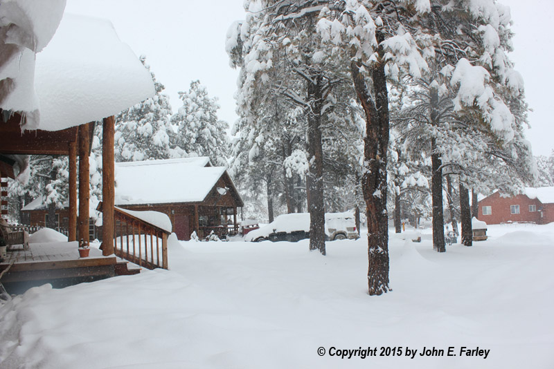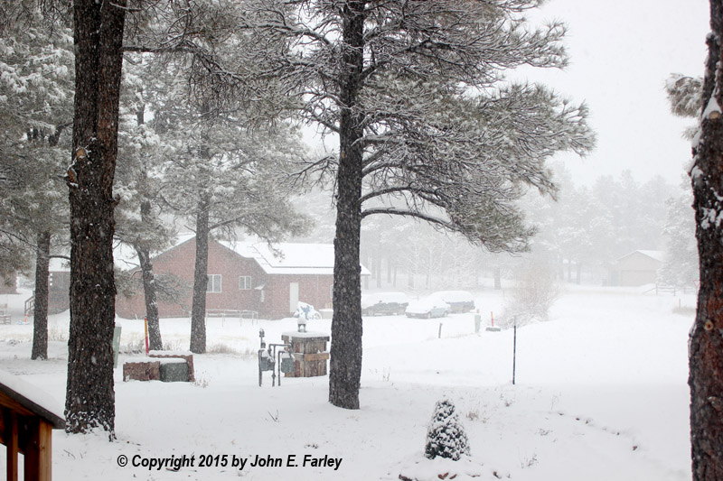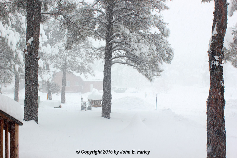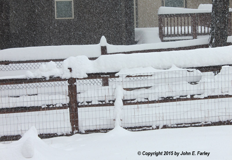 Snow began to fall at my home in Pagosa Springs, CO very early the morning of Saturday, February 22. By around 9 a.m., 2 inches had fallen, and a steady snow continued through most of the morning; indeed through most of the day. When this picture was taken around noon, we had received 4.7 inches of snow: