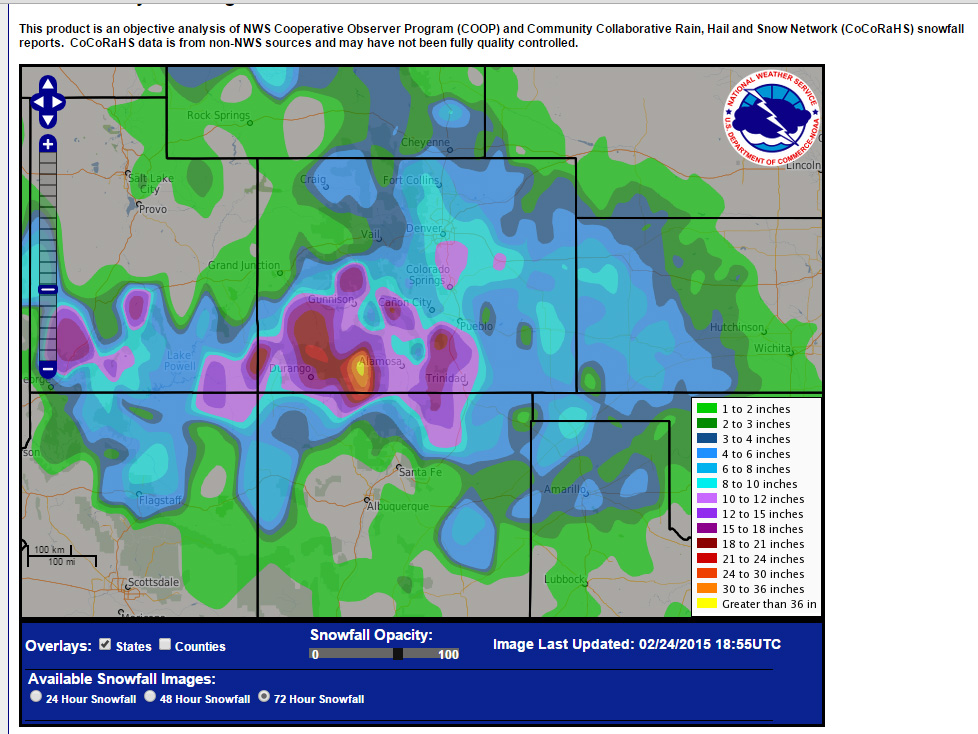 The following map from the National Weather Service shows total snowfall for the 72-hour period ending at 7 a.m. on February 24. It does not quite capture the entire storm, since some snow fell in northern Colorado before this period and some in Arizona and New Mexico after. But you get the idea. And note that the model forecast bull's eye over the San Juans verified very well! The yellow "greater than 36 inches" area is pretty much centered on Wolf Creek!