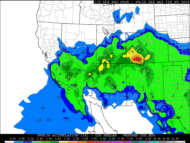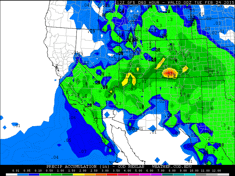The GFS model from earlier that morning, extending further to 6 p.m. on February 23, showed even heavier precipitation amounts, but again centered on the San Juans: