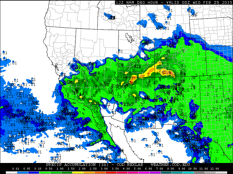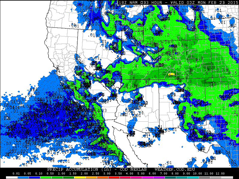 As the date got closer, the models increasingly began to focus on the San Juan Mountains and nearby areas as the bull's eye for very heavy snow. Here is a 33-hour precipitation forecast map from the NAM model from 18z on Feb 21 (noon mountain time on February 21) for snowfall through 9 p.m. mountain time February 22:
