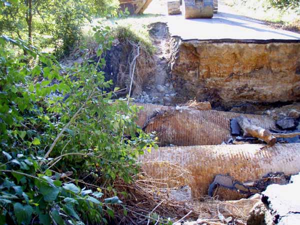 As you can see in these pictures, one problem was that underground utilities follow the road and thus were washed out, causing a temporary loss of gas and water service to about 50 residences. The pictures above show the incredible power of flowing water, and also illustrate one reason why you should never drive into a flooded area of roadway - it could be washed out under the flowing water. Anyone who drove into this would have been swept into the lake and faced likely drowning. In fact, the washout was found when police investigated to find out why people in the area lost gas and water service.