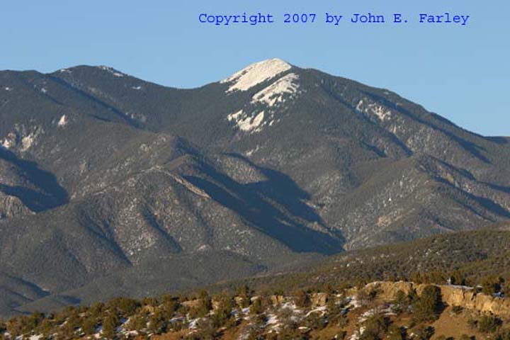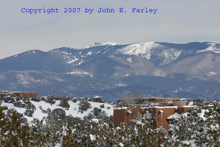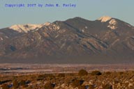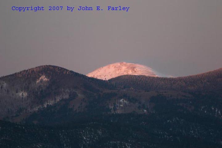 Farther south in the Sanger de Cristo Mountains, near Santa Fe, the alpenglow can also be quite impressive, as shown in the next two pictures. These pictures show Santa Fe Baldy at sunset, the first with a home illuminated by the setting sun in the foreground and the second taken when the sun had set in town and in the lower mountains, but while it still slightly illuminated Santa Fe Baldy.