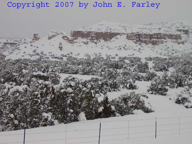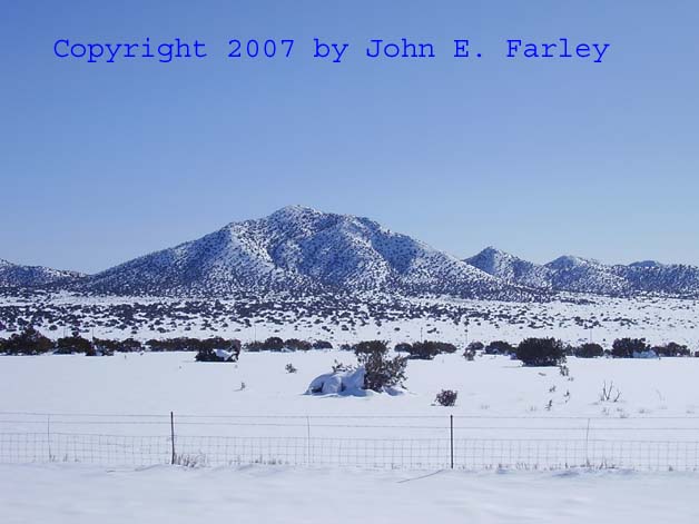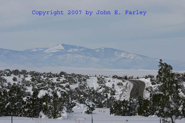 As shown in the next set of pictures, the desert, as well as the mountians, received a lot of snow. In fact, some high desert locations received in excess of two feet. The first picture below was taken near Cuyamunge early the morning of December 31, while the aforementioned low clouds still lingered over the Rio Grande valley. The second picture was taken about a week after the storm about midway between Albuquerque and Santa Fe, and the third picture shows the deep snow cover in and around the Cerillos Hills just southwest of Santa Fe.