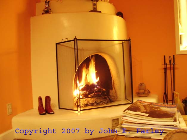 To wrap things up, here are a couple pics taken in Santa Fe during the height of the snowstorm. The first shows the snow piling up, with the only light coming from a nearby street light, along with whatever city light was being reflected from the clouds and falling snow. The second shows a New Mexico fireplace, which feels really good after a day of skiing or photographing the freshly-fallen snow!