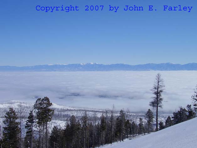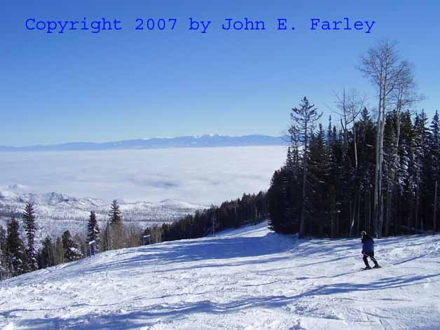 The next set of pictures are ones I took while skiing at Pajarito Ski Area near Los Alamos on December 31, the day after the storm.. The first is looking into the Valles Caldera, a valley that was created by the collapse of a huge volcano. The others are looking the Rio Grande valley. Both the Valles Caldera and the Rio Grande Valley were filled with remnant low clouds left over after the snowstorm, but at around 10,000 feet above sea level in the Jemez Mountains, I was well above the clouds when I took these pictures.