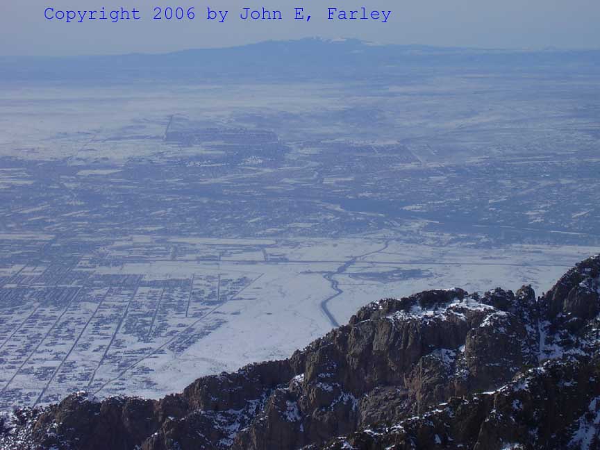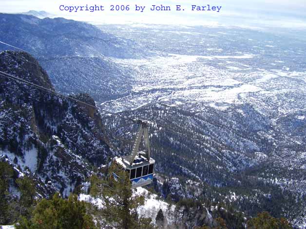 The next group of pictures, all taken from the summit of the Sandia Peak Ski Area on January 10, more than a week and a half after the big snowstorm, shows how white it still was around the Albuquerque area. The first picture, looking east, shows the southern section of the Ortiz Mountains and the high plains beyond. The road near the middle of the picture is the Turquoise Trail (NM route 14), the "back way" between Albuquerque and Santa Fe. The next shows the Sandia Peak Tram as it starts its journey down, and the third looks across the northern edge of Albuquerque, with Mt. Taylor in the distance.