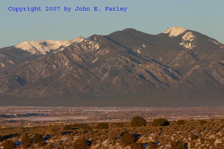 Speaking of the mountains around Taos, I was fortunate to pass through the Taos area around Sunset on January 4, enabling me to photograph the famous "Taos Glow." This is the alpenglow that occurs in the mountains near Taos when the light from the setting sun creates orange and pink tones in the mountains. The photos below are arranged in a sequence of decreasing sunlight intensity and increasing distance from the mountains (though with varying degrees of zoom using a 75-300 zoon lens), as I worked my way west looking back east at the mountains.