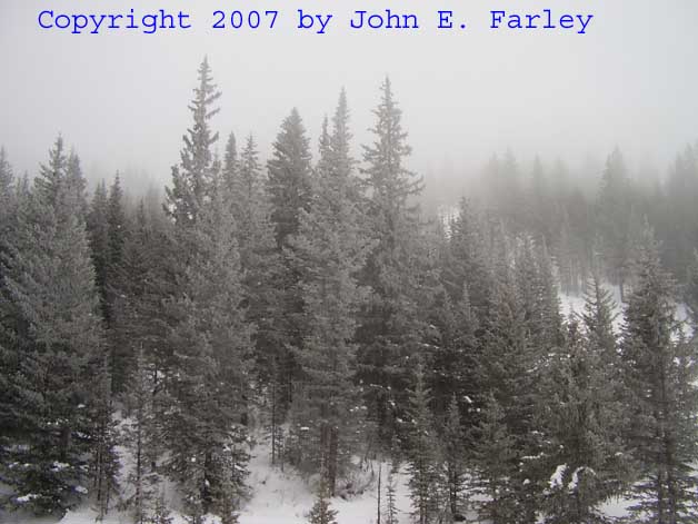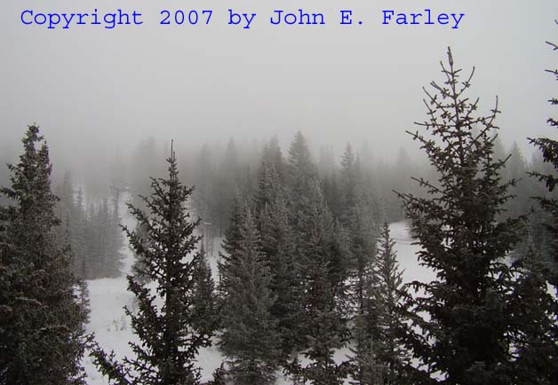 While skiing at Ski Santa Fe on January 5, I got a couple interesting shots as lowering clouds from an approaching snowstorm fogged the ski area and coated the trees with frost. The resut was these rather surreal images, both taken from the new Millenium chairlift which ran for the first time ever on this day: