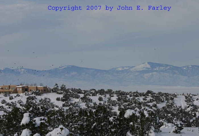 The first set of pictures shows some scenes around the Santa Fe area a couple days after the snowstorm. The first shows some pueblo-style homes near Santa Fe with the Santa Fe ski area in the mountains behind the home. The second is interesting because of the confluence of a number of elements: the home, the Jemez Mountains in the background, the flock of birds in the sky, and the fog in the Rio Grande Valley between the foreground and the background. The third photo, which I call "Road to Enchantment," also includes the valley fog and the Jemez Mountains.