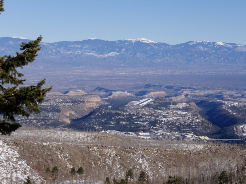 This picture, from just above the bottom of the Townsight lift, shows the view looking down at Los Alamos, with the Sangre de Cristo Mountains in the background. At the upper right you can also see Ski Santa Fe in the distance: