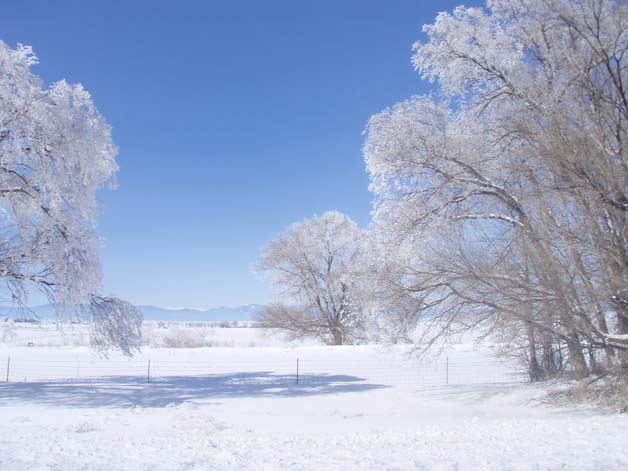 While driving from Santa Fe, NM to the National Storm Chaser Convention in Denver on February 12, I encountered some rather spectacularly rimed trees a little north of Springer, NM along I-25. The rime formed on the trees due to fog with temperatures well below freezing, resulting in the supercooled droplets of the fog freezing onto the trees. Fortunately, the fog had cleared well before I passed through the area, but with temperatures in the teens and little wind, the rime remained on the trees and the deep blue sky provided for a spectacular backdrop. The low temperatures were undoubtedly helped along by the deep snow cover of about a foot and a half from a series of recent snowstorms in New Mexico's northeast highlands - the area around Springer had considerably more snow and lower temperatures than either farther south around Las Vegas and Santa Fe or farther north from Raton into Colorado. Here are a few of the pictures I took: