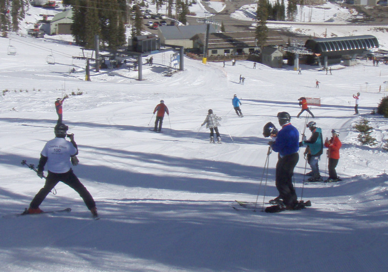 Looking down toward the Base Camp lodge. The leading skier in this picture, Charles Elliott, was celebrating his 100th birthday on skis. He, along with two other pioneers of the Wolf Creek Ski Area, is in the Colorado Ski Hall of Fame.