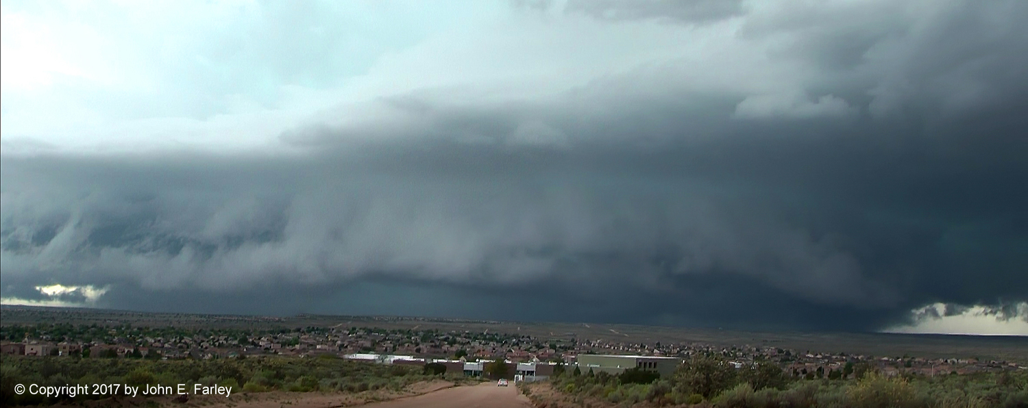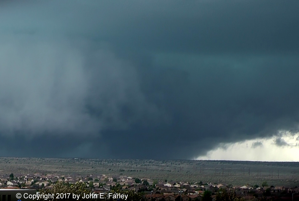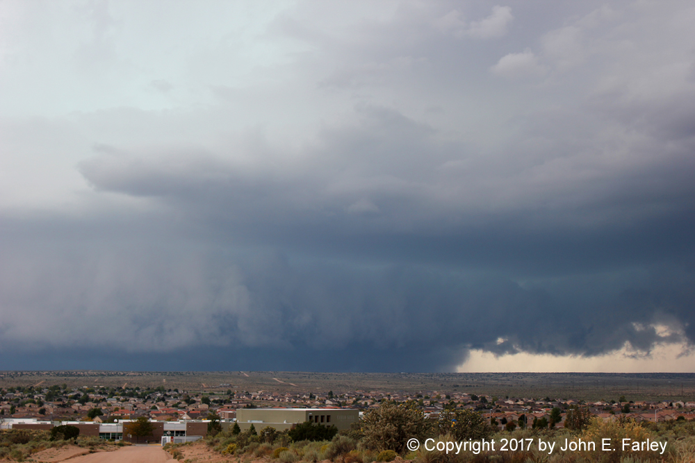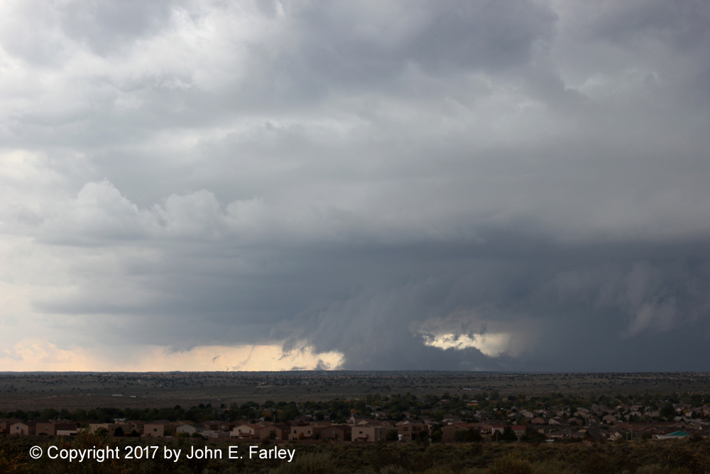 My plan worked pretty well. By the time I got to the US 550 exit from I-25 at Bernalillo, around 3:50 p.m. I could see the storm to my WSW with lowerings under the updraft base. I went SW off 550 on Paseo del Volcan, stopping once or twice for pics but eventualy going all the way to where it T-intersects with Unser, then N and W slightly from there, to a high spot in Rio Rancho, NM with a good westward view. It gradually became evident from this viewpoint that the storm was HP (a high-precipitation supercell), with a wall cloud near the center of its leading edge, a low shelf cloud at the leading edge of the heavy RFD (rear-flank downdraft) precipitation south of the wall cloud, and another shelf cloud along the leading edge of the forward flank precipitation NE of the wall cloud. You can see that structure in this picture taken around 4:25 p.m.: