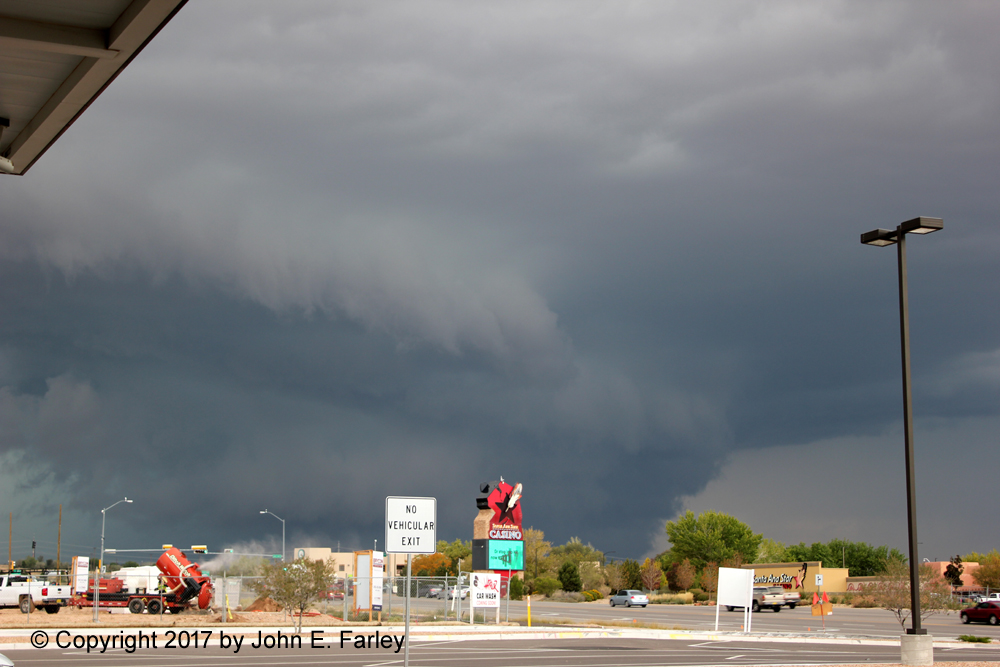 Eventually the RFD gust front and precipitation were getting close enough that I needed to move, and I figured I could basically stay ahead of the storm as I retreated back to the NE. Near Unser and Paseo del Volcan, the outflow ahead of the precipitation core caught up to me and I was blasted with blowing dust. But I got back ahead of it heading E then NE on Paseo del Volcan to Bernalillo, where I made a quick gas stop. Now the wall cloud was just a mile or two to my NW. Here is a picture of the wall cloud looking NW from the gas station:
