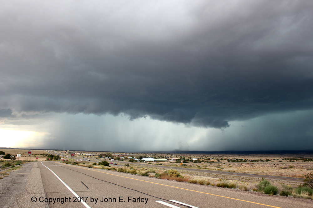 That was pretty much the end of the chase, because I had to continue toward Santa Fe to stay ahead of the storm, but new storms were now going up around and ahead of the syupercell. From one of these I got torrential rain and a little hail at I-25 and NM 599. I figured then that the supercell would be absorbed into what seemed to be a developing MCS, but it managed to keep its supercell character as it moved through the Galisteo area and on to the south of Las Vegas NM. In those areas it triggered flash flooding and road washouts along with reports of penny-sized hail. All told, the storm lasted at least 9 and a half hours as it tracked from near Grants (around 2 p.m.) to at least midway between Las Vegas, NM and Tucumcari, NM (by around 11:30 p.m.). All in all, a very impressive HP supercell storm, reminiscent of what I used to often chase in IL and MO, but with better visibility of the storm. Not too surprising to get this type of storm, I guess, with very high moisture along with veering wind profiles but not super-strong upper winds.