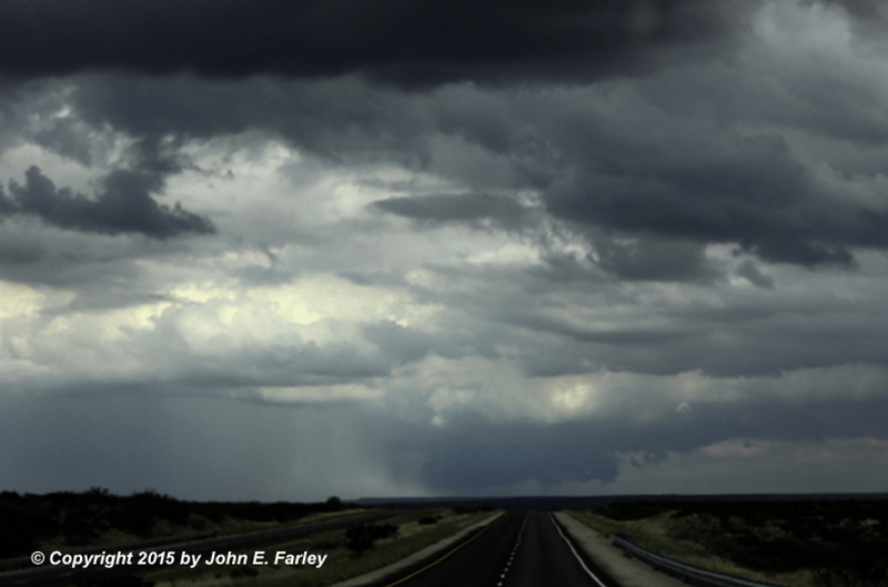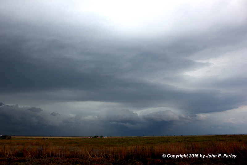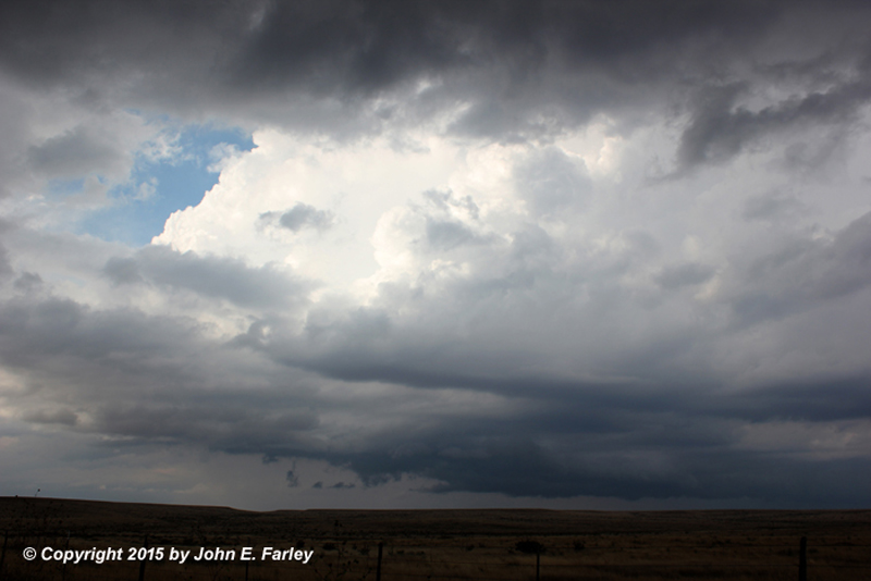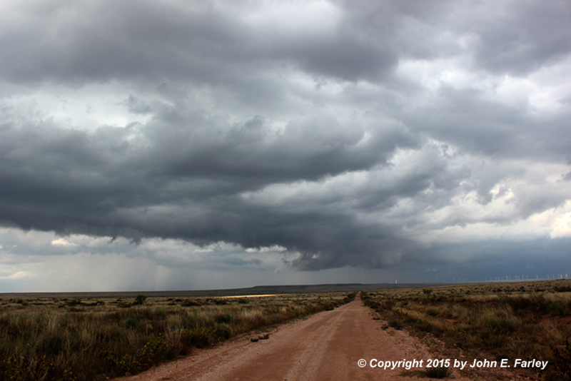 By the time I could catch up to the southern storm, it had moved N of route 70. For a while it had been just the two strong surface-based storms, but now a number of others were popping up to the S, E, and NE. I decided to head NW from Kenna (which is about midway between Roswell and Portales) to intercept the southern of the two initial storms, now to my NW moving slowly NNE. But a new storm to my NE was gradually strengthening, and new storms to my SSW were moving toward the dirt road I was on - a place I did NOT want to be caught in a heavy storm. I returned to 70 and headed NE to intercept the northeastern storm, which continued to strengthen. I headed N from Elida to intercept this storm, which by 3:00 p.m. had the first SVR warning of the day from ABQ NWS. The storm produced 55 mph wind and nickle-size hail at the Melrose Bombing Range to my NW around 3:30, and by 3:40 I could see a large but from my initial view low-contrast wall cloud. At this time, the storm appeared to be taking on HP supercell characteristics. I headed north as close as I could get to the storm without driving into it - it looked still quite intense but more outflow-dominant - then I headed east to Portales.