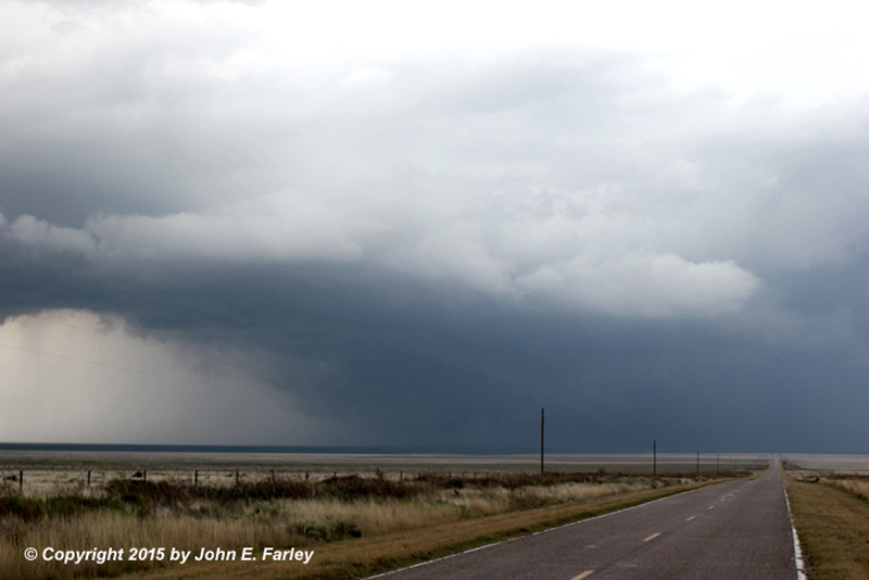 I am not entirely sure if this is the same storm I had been on before or another that formed just to its E or NE - storms were going up all over the place now - but it clearly was the one to go after now. But I had to get through Portales, which took around 15 minutes. But by 4:35, when I was through town and again had a good view of the storm, it was becoming more linear but formed a very impressive shelf cloud: