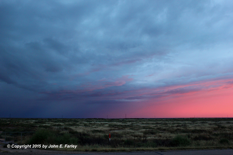 I took an alternate route west out of Clovis after eating. Storms now were very widespread with the main line moving into Clovis, but nothing SVR-warned, so I figured if I watched for flooding, I could safely start back toward Santa Fe. I avoided 60/84 going out of town, because it was quite badly flooded already when I had come into town and very heavy rain had moved in again. This turned out to be a good choice, as a mile of the road was closed at the west edge of Clovis. I saw lots of minor flooding but was able to get through and head west to Ft. Sumner where I decided to stay for the night. Intense rain and some very close CG lightning occurred for the first 10-15 miles out of Clovis. Then it lightened up, and I got a nice pic of sunset into rain S. of Ft. Sumner before arriving there around 7 and calling it a day. Here is the picture taken at sunset: