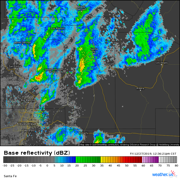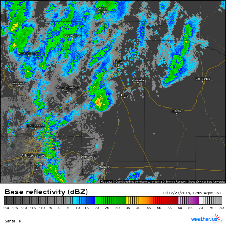11:30 a.m. - I am thinking that if I can get to high enough an elevation for the p-type to be snow, I can get thundersnow. The temperature in Santa Fe is in the low 40s, but colder is air likely to be pulled down with precipitation, so in the areas getting precipitation, it is likely colder, in the 30s. The Santa Fe elevation of 7000 is borderline for rain or snow with this system, so I want to intercept the storms at a higher elevation. However, with the storms moving almost due north, it looks like they will pass west of the mountains. So after some indecision, I decide to intercept in the higher terrain (but not mountainous) north of Santa Fe along route 599.
