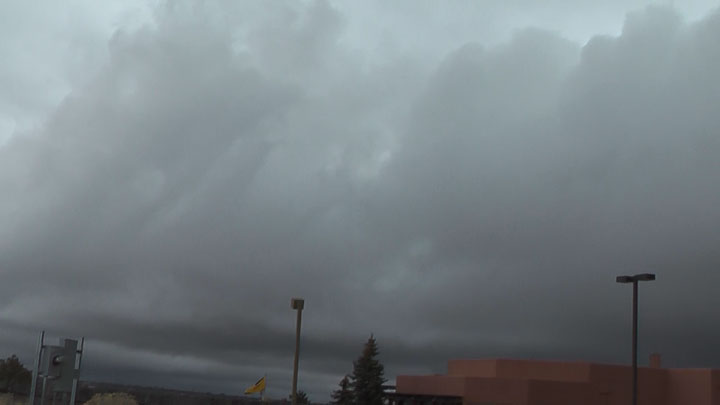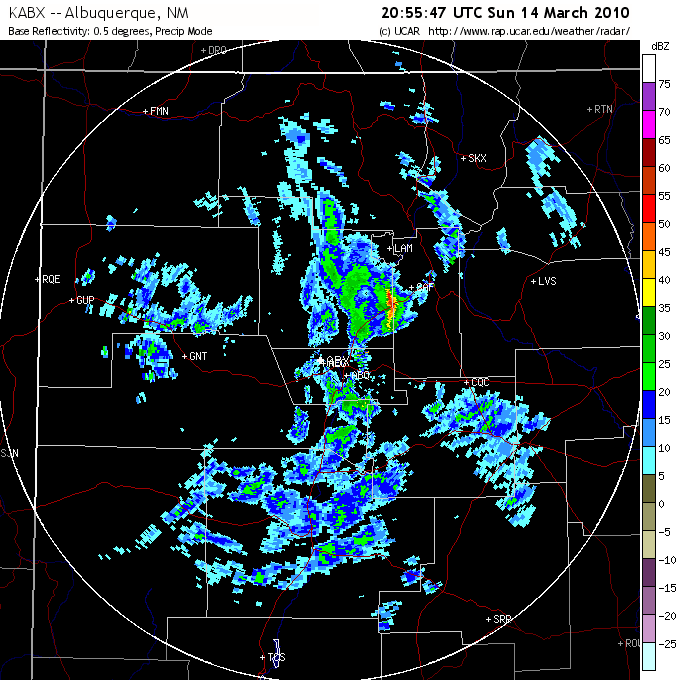 I was watching the weather closely today, as a decent chance of thundersnow was in the forcast as a strong low pressure system, quite tightly wrapped up, would track southeast across New Mexico, passing to the west of Santa Fe and thus creating the best dynamics somewhere near Santa Fe. Through the morning, light snowshowers moved over the area, but it was evident that some heating from the afternoon sun would be needed to get convection strong enough for thundersnow going. Shortly after 2 p.m., I noticed that the rain and snow showers which had been tracking northeast through the general Albuquerque area were intensifying. I noticed an especially strong cell just west of the Kewa (formerly Santo Domingo) Pueblo, moving northeast just to the west of I-25, and I knew it was time to go. Between the afternoon sun, the approaching low, and the fact that the cell was approaching the higher terrain of La Bajada Hill, I knew this cell, already strong, had a definite chance to intensify and give me some thunder and lightning, even though none was showing up on the lightning detector on Weathertap. Also, the upper air and surface temperatures were cold enough, despite the heating of the afternoon sun, to keep the precipitation mainly snow or graupel (snow pellets), especially once it got to the top of La Bajada Hill, but maybe even in the Rio Grande River valley where the storm was then. Time to head out!