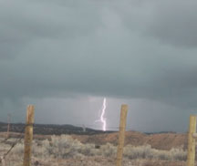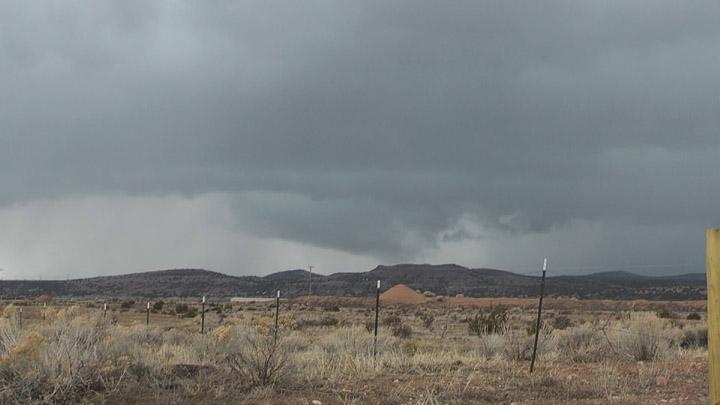 As soon as I could get a good view of the line of storms as I headed southwest down NM 599 (the Santa Fe bypass), I could see lightning, and fairly frequent lightning at that, both in-cloud and cloud-to-ground (CG). My original plan was to head down I-25 and intercept the storms near the top of La Bajada Hill, but with the storms moving rather quickly toward the NNE, I thought trying to go more west and less southwest would be better, so I turned west at Airport Road and continued out the extension of Airport Rd. past the airport. However, the road turned to the southwest, so I kind of ended up in the same area anyway. A mile or two southwest of the airport, I stopped to video, and was lucky enough to get a flash of CG lightning. Here is a video capture: