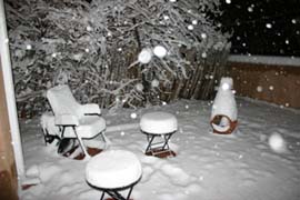 Figuring I would get into some bad driving conditions if I lingered much longer, I continued through La Cienega and got on I-25 to head back to Santa Fe. I got back ahead of the precipitation, and as I got into Santa Fe I observed some interesting structure along the leading edge of the precipitation. Shortly after this, it began to snow, and as of 11:30 p.m., 8 hours later, it was still snowing, with an accumulation of 7 inches. Here is a picture from around 10 p.m., with 6 inches or so then: