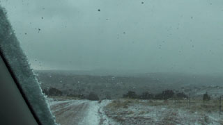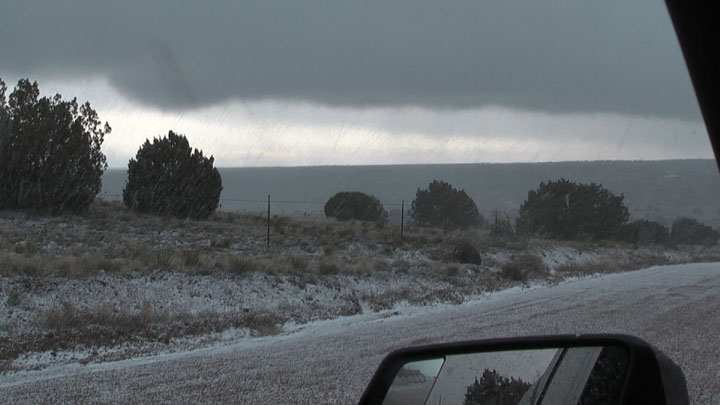 The storm at this time was strong enough that the ABQ Nws put out a special weather statement on it, mentioning the possibilty of sleet, hail, and extremely restricted visibility from heavy snow. For the record, I did not observe any sleet or hail, just graupel and snow. However, some of the snow pellets were rather large, at least 1/4 inch in diameter, and maybe bigger. And I was not in the strongest part of the storm, so there certainly could have been hail somewhere. Once I got into the area of precipitation, I did not observe any more lightning; the strongest cell where the lightning was occuring continued north, passing between Los Alamos and Espanola.