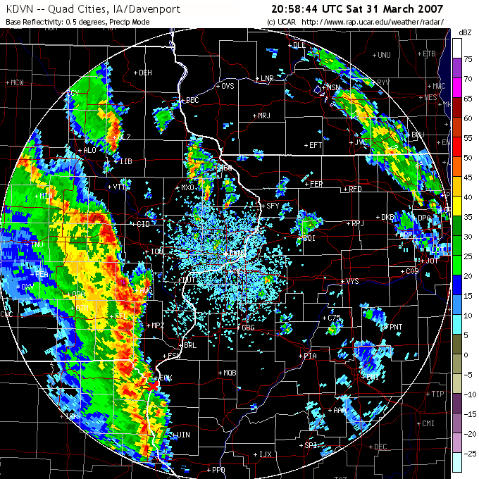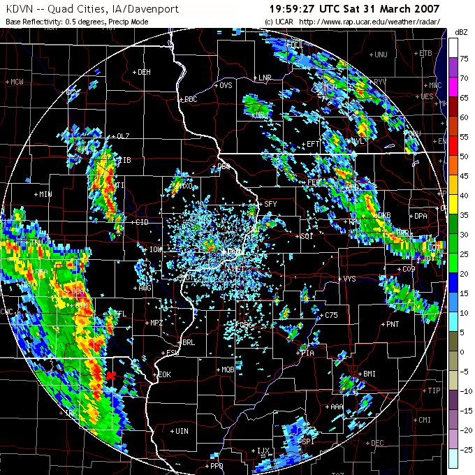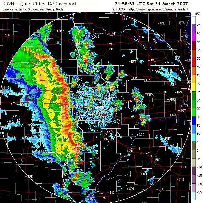 Davenport Radar, 3:58 pm - I am repositioning east as the storms are about to overrun Keokuk. Note the little extensions northeastward from the line - one is to my SE, another to my NW, and another one yet farther north. These were newly developing line segments that soon became the leading edge of the line.