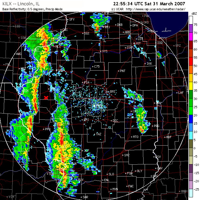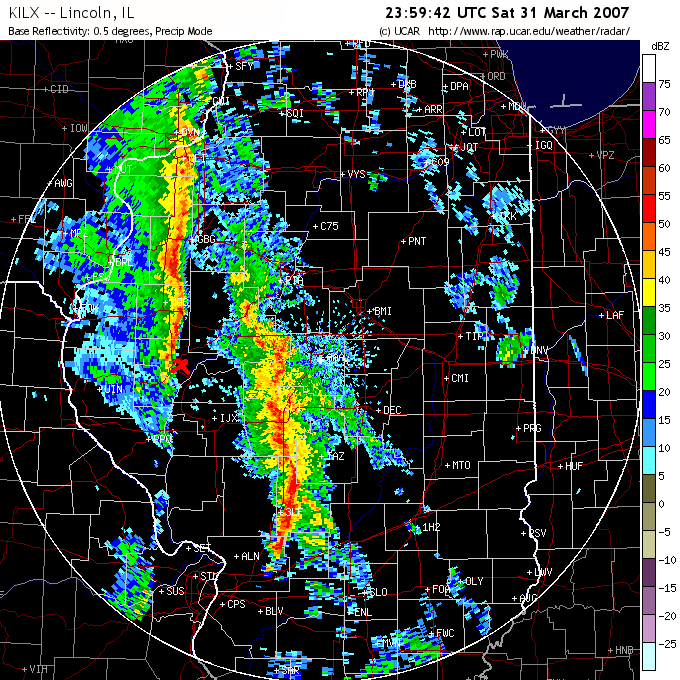 Lincoln Radar, 6:59 pm - I am on the tail end of the line near Rushville, as the line goes SVR warned again and produced wind damage in northeastern McDonough Co.