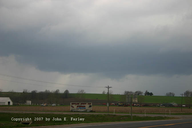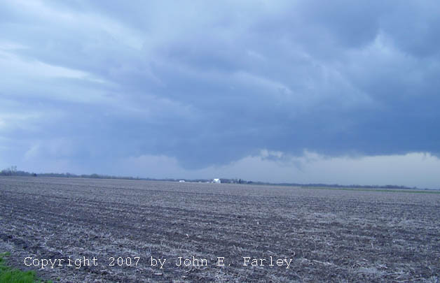 I backtracked to around Granger, and turned south a little to watch the storm approach. At this time, a small lowering that had a bit of a wall cloud look to it formed to my west along the line, but it did not persist for long at all. There were other lowerings along the gust front, too, but none rotating that I could see, and none very persistent - they just seemed to be lowered areas on the gust front. Moreover, the warning was eventually dropped on the storm to my south (which was racing towards me at 50-55 mph, but still a fair distance down the line to my south or SSW). So, I decided to move a bit farther east, but as I was about to turn back on to 136, I noticed this lowering to my northwest. I watched it for a couple minutes; I think it, too, was just a lowered area in the shelf cloud but in any case it quickly disappeared in the rain. So, I headed east on 136 back toward Kahoka, and soon heard a new warning for a cell to my SSW along the line. I thought I could intercept it around Kohoka, but could soon see a new line of precip forming to my SE, and figured that if I did not get east, I would get swallowed up in the heavy precip and see nothing. Originally, I had hoped to get ahead of the storms and watch from a spot in the wide flood plain along 136 between route 61 and the Des Moines River, but it was clear that the rapidly intensifying line segment to my SE was going to overrun me even there, so I decided to cross through Keokuk into IL. As I crossed under the rain band, it intensified rapidly, and the weather radio put out a statement for a line of storms developing from Vinton, IA to Keokuk, with warnings likely soon. I began getting quite a bit of lightning and thunder right behind me as I crossed into Hancock, IL, where I stopped and looked back to see an impressive shelf cloud - but the storms were about to overrun me, so I repositioned a little east of town and photographed the rather impressive shelf cloud: