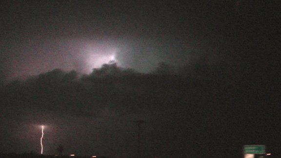 Although storms behind this supercell lined out, the supercell stayed ahead of the line and crossed into Pike and Jersey Counties, IL, still tornado-warned. When it pulsed up again as it was crossing into Macoupin County, I decided to do something I usually do not do - chase the storm at night. I don't generally regard night chasing as safe, but since this storm had stayed isolated and on the same eastward track so consistently over many hours, I thought I could chase it safely if I stayed a reasonable distance away. As it turned out, I found the chase difficult, partly because I left in too big a hurry and left behind several things I could have used, and partly because in the dark it was hard to navigate and to find a spot with a clear view, or even tell whether any given spot HAD a clear view. Also, within a block of home, I sent both my computer and video camera flying when I hit the brakes to avoid a muskrat crossing the road in front of me. Luckily, no damage to either (or to the muskrat, which I narrowly avoided), but it was a reminder that animals that are hard to see until the last minute are a real hazard of night chasing. Nonetheless, I did get a decent view of both anvil-crawler and cloud-to-ground (CG) lightning from Route 4 just east of Worden, IL, at that time about 10 miles from the storm: