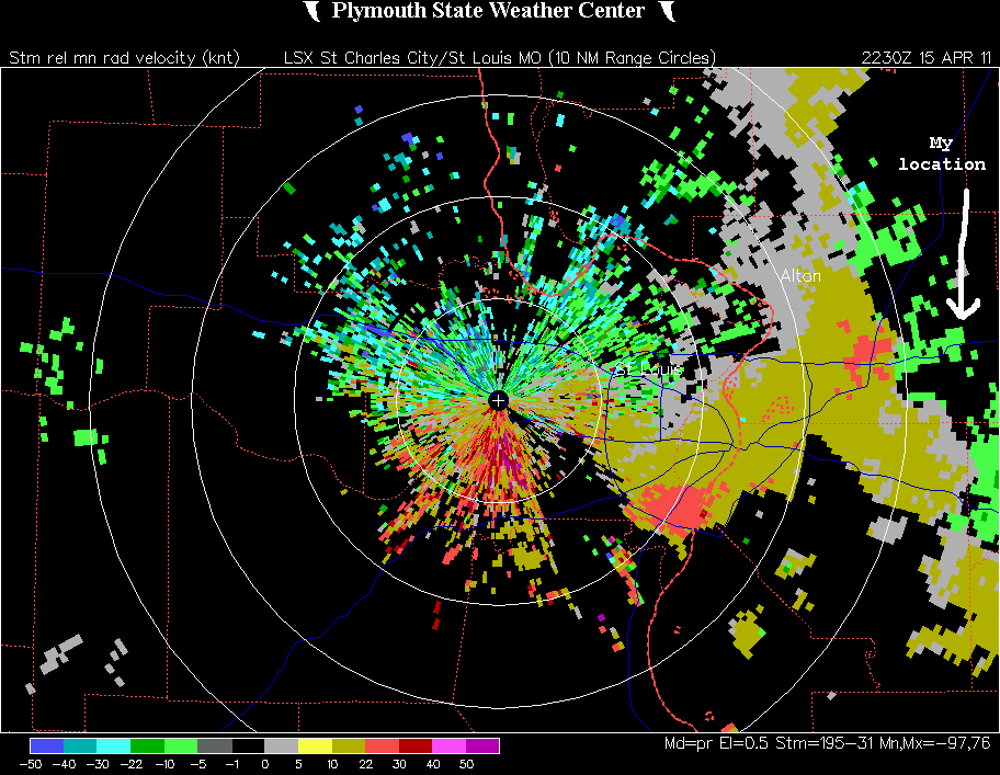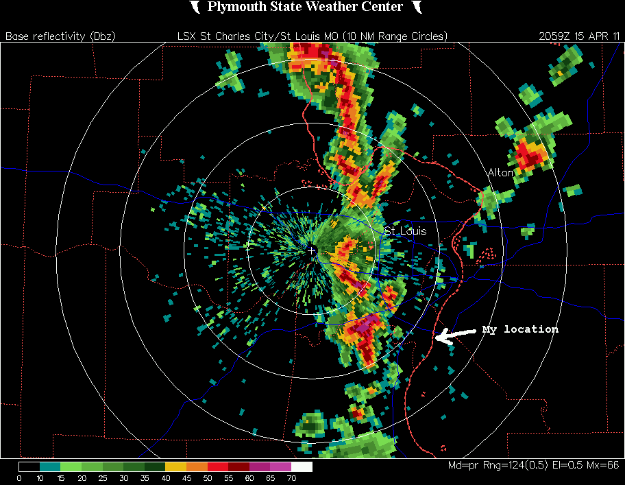 2. An isolated severe storm northwest of St. Louis, right on the warm front (and ahead of the line of storms forming near the cold front), near Bowling Green.