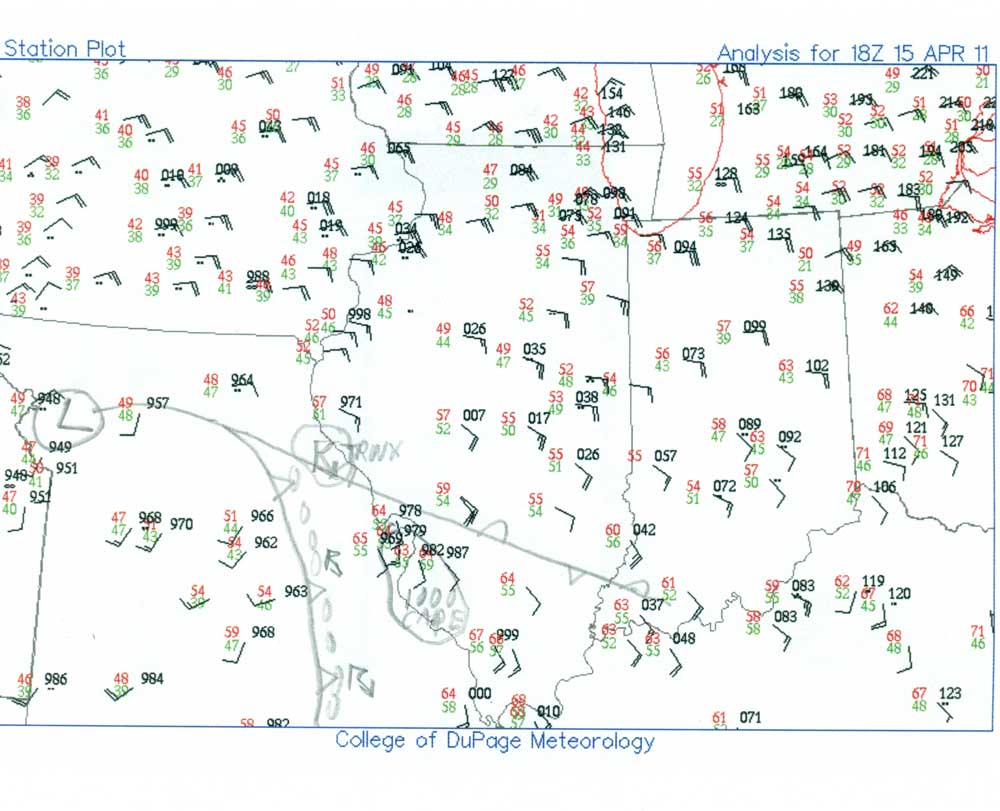 In many regards this forecast panned out, but certain details led to tornadoes farther north than I (or many other forecasters) had thought. A detail which I had observed and considered, but ultimately disregarded in favor of other factors, proved crucial in where tornadoes occurred today. A little after 1 p.m., I downloaded surface data for Illinois and did a hand analysis. A scan of this is linked here. Note the following: