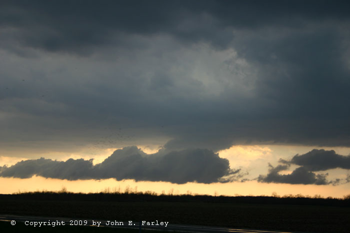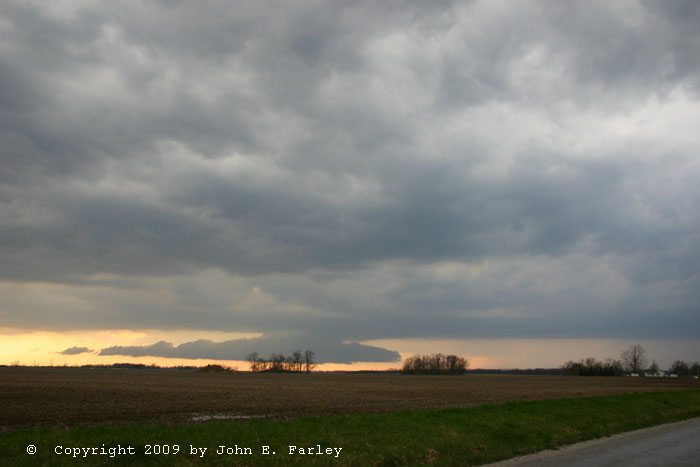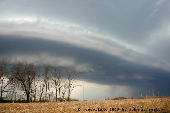 I took this picture just after driving through the south end of the line, where I encountered north or northwesterly outflow gusts of around 40 mph or a little stronger. However, when I took this picture, I was in the southeasterly inflow ahead of the line which I would estimate as gusting to around 35-40, a guess confirmed by a measured gust of 37 in Macomb ahead of the line. So, there was very strong convergence at the leading edge of the line. I stayed ahead of the line through Macomb, as heavy precip filled in behind the southern extent of the shelf cloud: