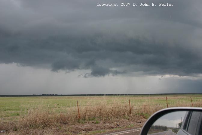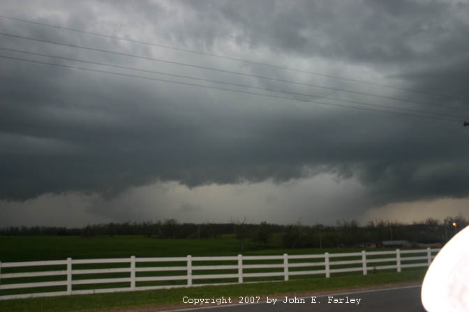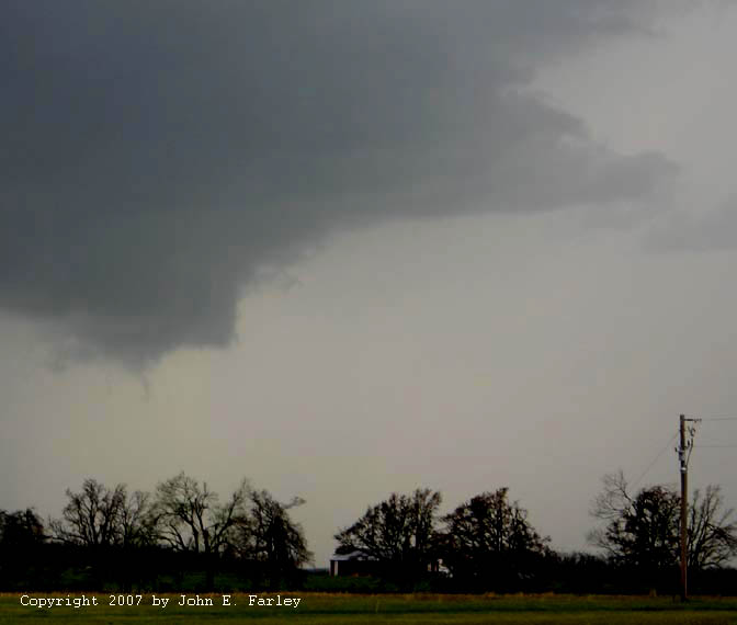 This time the area behind it filled in, and it became elongated and more of a shelf cloud feature. But the northern end of the feature remained lowered quite persistently as the storm moved toward Springfield. Somewhere east of Monett, I think somehwere around Aurora, it formed this: