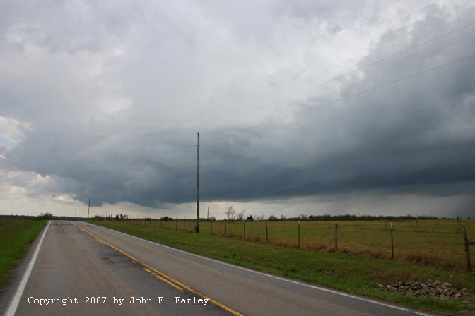 As I was driving toward the storm on 65 after taking the pictures above, it formed one of the tail clouds Dan described in his chase report. It briefly had the appearance of a funnel, but it was at about a 45 degree angle and was not rotating, so I agree with Dan that this and other features he observed earlier were inflow tail features, not funnels. I see there were a couple funnels reported north of Springfield at a time when I was too far from the storm to see them, but based on Dan's report and what I saw later, it is possible these reports were erroneous. OTOH, the wall cloud was definitely rotating at times. Once I had caught up with the storm near March, it weakened rapidly after producing the brief rotation I observed near there. I think partly this occurred because it was starting to merge into the main line of storms, which was now rapidly approaching from the West. The main line was moving northeast, while the isolated mini supercell was moving about due north or perhaps even a little NNW. I poked just west of Buffalo to get a few final pictures of the approaching line of storms, which was again looking pretty healthy and like it might have a little hail in it: