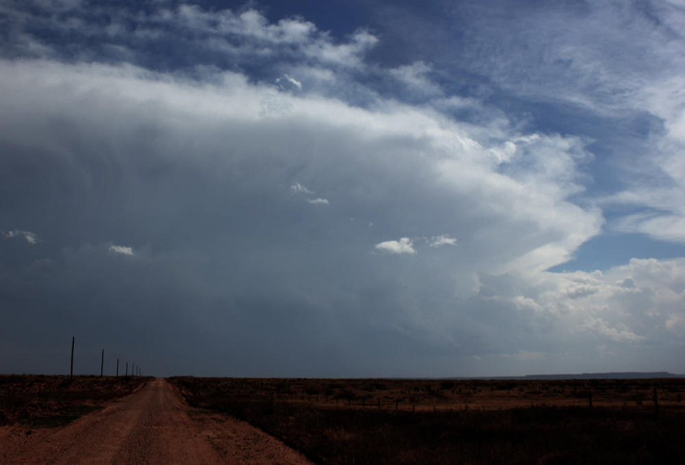 3:00 NM time - I am headed south from Endee on NM state highway 93, which unfortunately is unpaved for 16+ miles, toward the supercell storms. It is amazing what passes for a state highway in NM! The closer storm to me was north of Clovis. Here is a view of that storm as I headed south toward it: