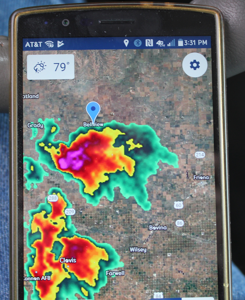 3:30 NM time - I arrive in Bellview, NM and watch ths storm for a while before heading east. This storm is the northernmost of two storms and has the appearance of supercell character at this time, although both of the storms were high-based as supercells go. The other storm south of it, roughly over Clovis, appears less organized at 3:30, but after that rapidly intensifies, takes on supercell character, and becomes the dominant storm of the two. From this time on for the next hour or so, large hail is reported in and around Clovis - 1-2 inch hail, and piled deep in places. From Bellview, I photograph what may have been a brief mid-level funnel to my WSW on the NW edge of the northern storm. However, it dissipated quickly and I am not 100 percent sure it was a funnel - it may have been narrow scud - but it had the look for a while. Here is a radar image from around this time:
