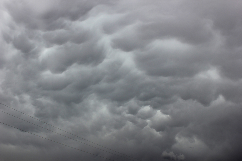 5:10 - I turn south toward Friona. I phtograph mammatus, then after a while can see flames from the fires. I stop with a couple chase tour vans (Extreme Tornado Tours) to watch the flames, now being fanned by the strong wind around the thunderstorms. The location of the fires is NW of Friona, SE of Bellview, NM. Here is a picture of the mammatus: