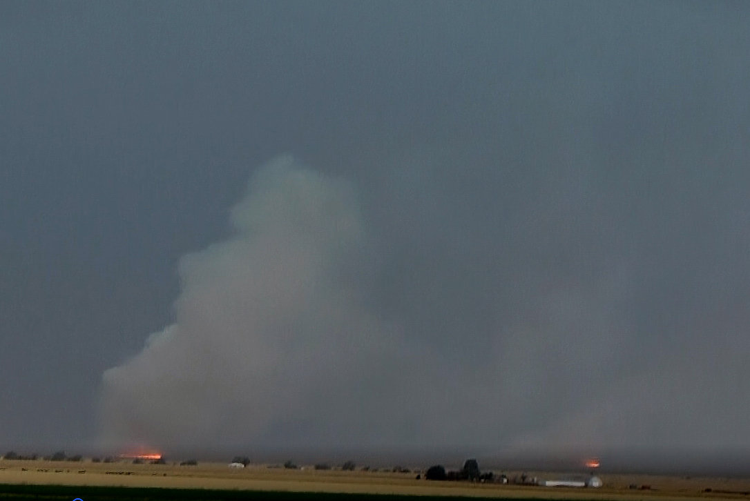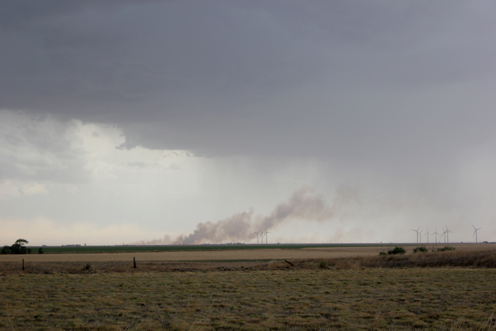 I pass through Friona and stop south of there to watch the storm. There is lots of blowing dust along a gust front moving toward me from the SW, and I see what appear to be couple distant gustnadoes along the gust front. Also the smoke from the fires to my NW is being blown hard and close to the ground by the outflow winds: