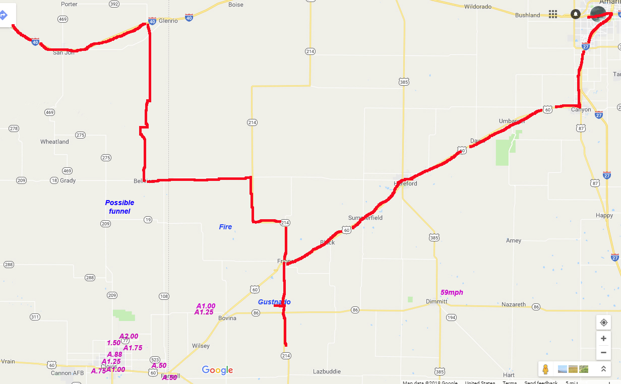 I did indeed encounter storms right along the dryline and eastward. By the time I stopped for gas in Santa Rosa, there were storms in the area, but they were high-based and looked pretty moisture-starved. I decided to stick with my plan of going after storms farther east, where the HRR was predicting stronger storms would eventually go up. As I was between Santa Rosa and Tucumcari, I could see that the storms right on the dryline were strengthening, but I could also see a new towering cumulus going up rapidly farther east, perhaps somewhere near Clovis. Soon this glaciated and another went up right next to it, and I decided this would be the storms I would go after. To intercept them, I would need to go south from San Jon, Bard, or Endee. I decided I would be too far behind the storm if I dropped south at San Jon (but that is where the road is best, so maybe I should have), and as it turns out I headed south from Endee, right near the TX state line. Here is a time-by-time account of the active phase of the chase: