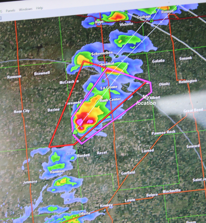 By the time I was around the Pratt, KS area, it looked evident that I would need to shift my target north a little, as storms were firing in a line a little south of the front, from WSW to ENE west and north of Great Bend. By around 4 p.m., chase strategy was becoming obvious, with an intense storm WSW of Great Bend. I headed WNW from Great Bend on 96. As I headed into Albert, the storm (Storm 1 herinafter), already SVR-warned, got its first TOR warning at 4:11 p.m. By around 4:15 or 4:20, I had a good view of the storm from a high spot on a gravel road a little SW of Albert. There were intermittent ragged, scuddy lowerings with some rotation in good contrast south of the precip, but a more solid lowering largely hidden in the rain. Here is a radar image and a couple pictures from this time/viewpoint: