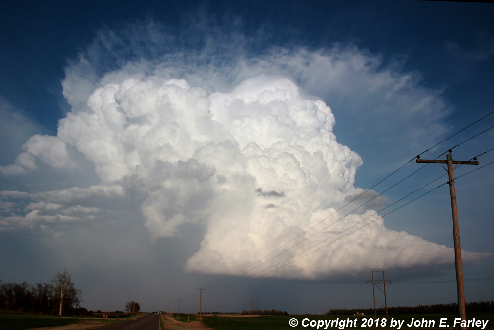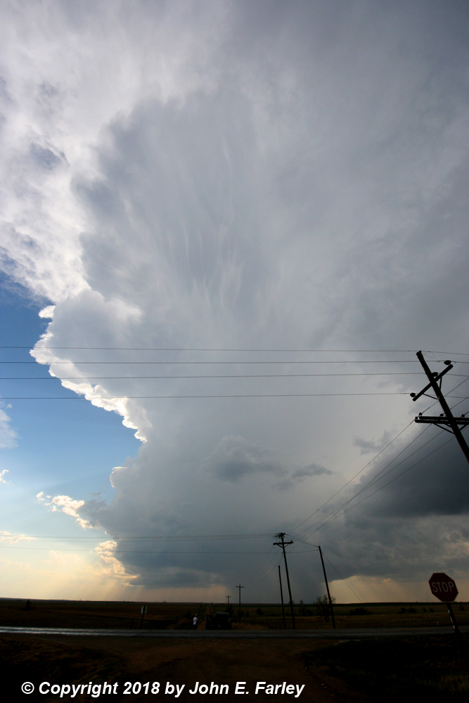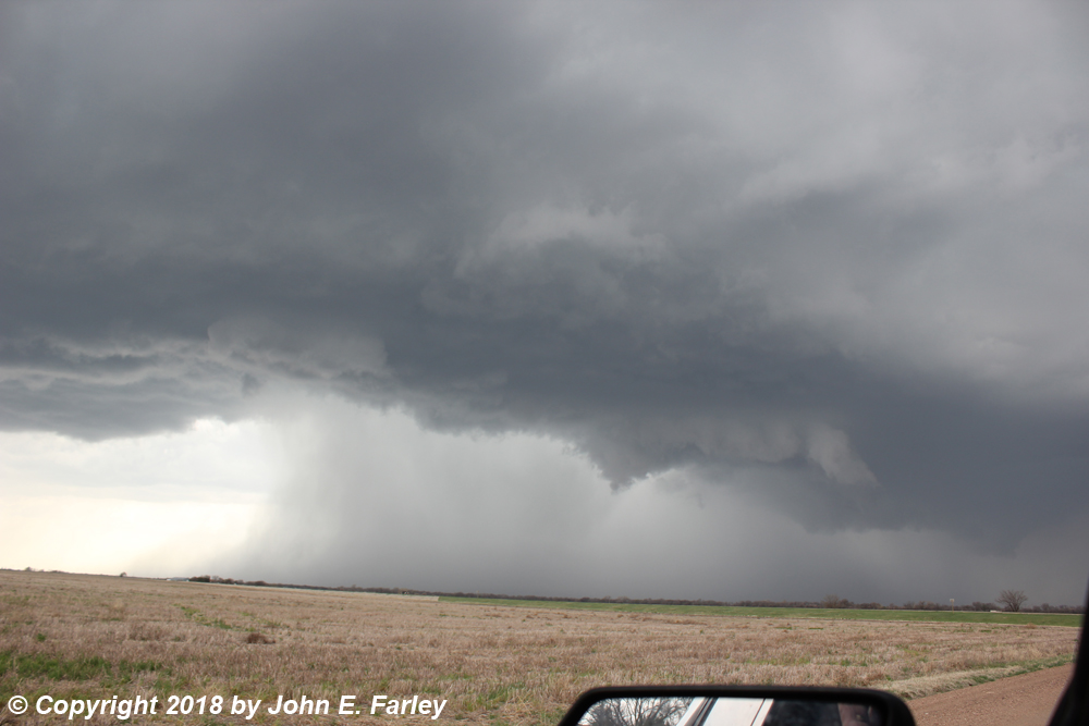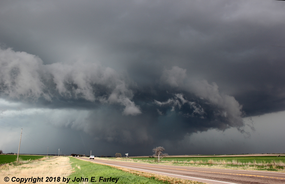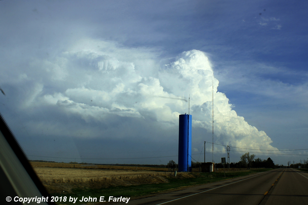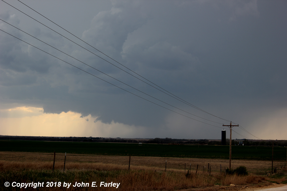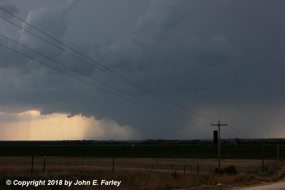 I went south on 281 to the paved road that is the eastward extension of route 19 where it meets 281 just east of Seward, and turned east onto that road. The storm (Storm 2) was to my east, about to cross the road. I drove toward it, getting this picture looking at it almost directly to my east, as it moved to the ENE: