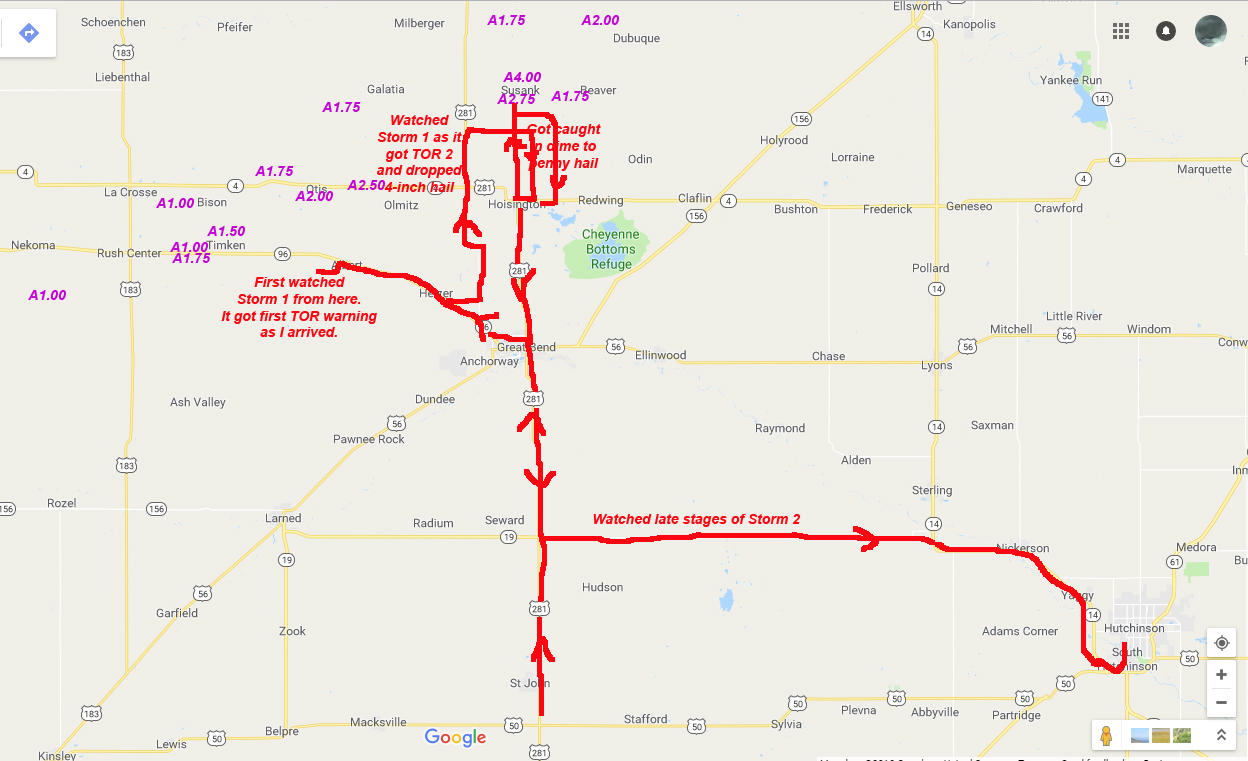 Here is a map showing my route for the day and where I viewed the storms: